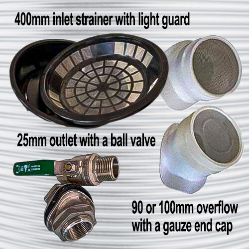 - A 90mm or 100mm sized mosquito-proof overflow fitting at the top of the tank wall, directly under the lid